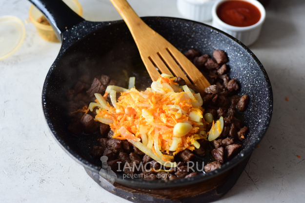 Затем пассерованные овощи выложим в сковороду к говядине.