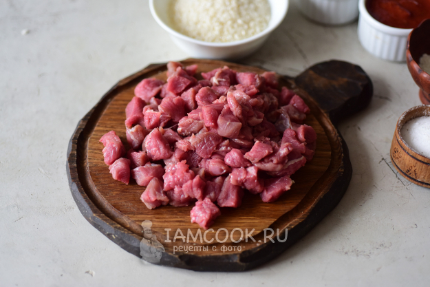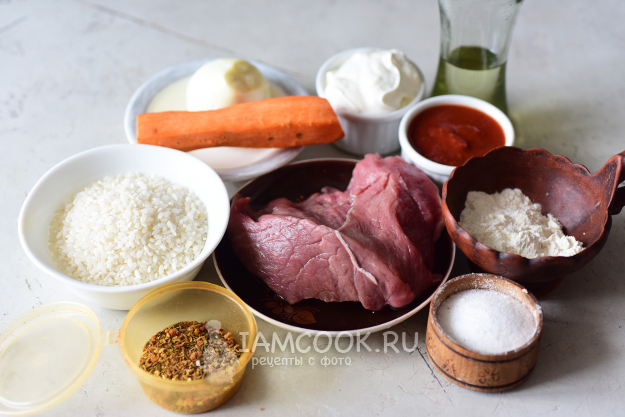 Подготовим необходимые ингредиенты для гуляша из говядины с рисом и подливкой.