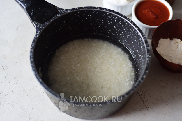 Рис промоем до прозрачной воды, выложим в сотейник, зальем водой, посолим и поставим вариться.
