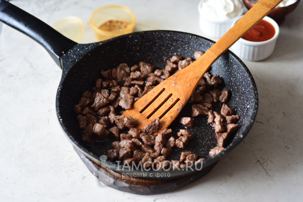 Растительное масло хорошенько разогреваем на максимальном огне в сковороде, выкладываем кусочки говядины и, постоянно помешивая лопаткой, будем обжаривать до полного выпаривания жидкости и появления легкой золотистой корочки.