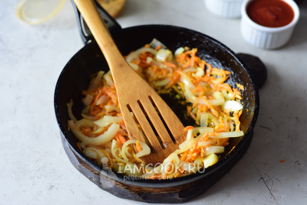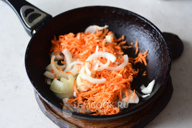 В отдельной сковороде разогреем растительное масло и выложим лук, нарезанный полукольцами, и морковь, натертую на крупной терке.