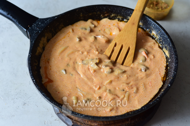 Мучную смесь зальем в сковороду, добавим сметану, перемешаем.