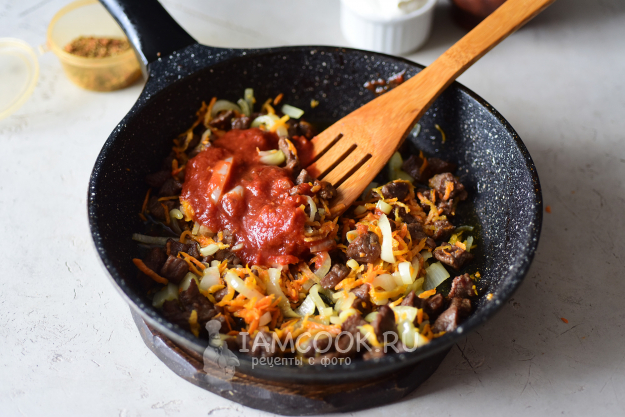 Добавим томатный соус, перемешаем и будем тушить на небольшом огне 15 минут.