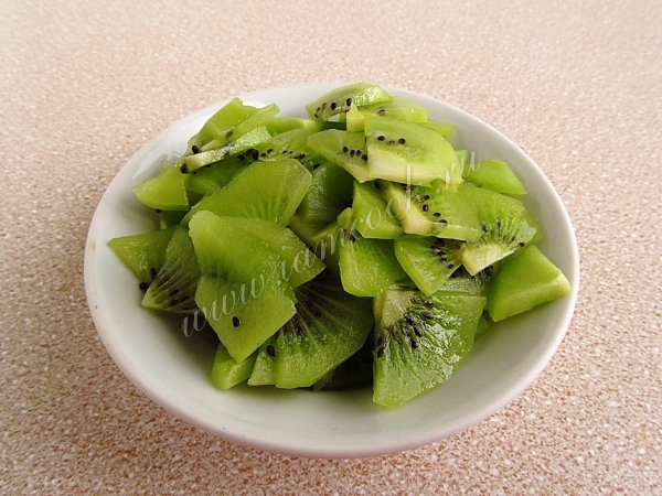 Плоды киви очистить от кожицы, разрезать пополам, а затем каждую половинку тонко нашинковать поперёк.