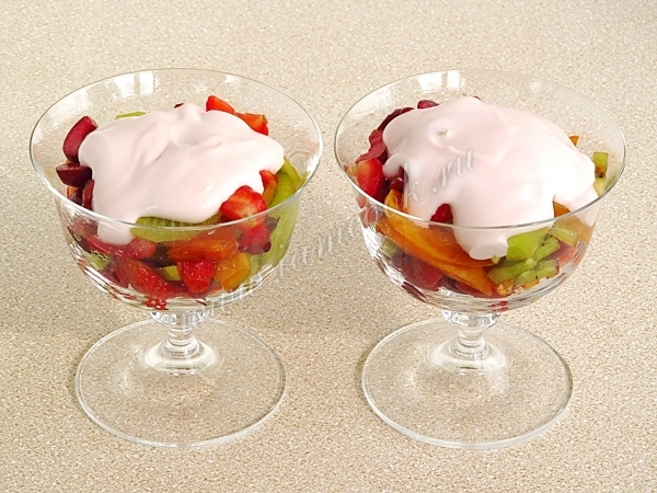 В самый разгар ягодного сезона можно побаловать себя необычными и очень вкусными витаминными десертами. Изюминка этого салата - соус из йогурта и мороженого. Подать десерт лучше порционно в красивых вазочках или креманках.