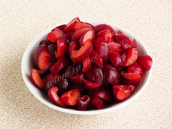 Черешню вымыть, обсушить, удалить косточки, а мякоть нарезать мелкими кусочками.