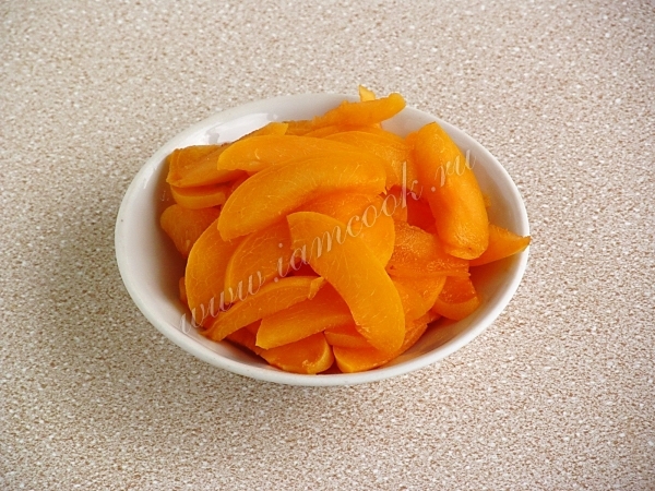 Абрикосы вымыть, разрезать по бороздке пополам, вынуть косточку, а мякоть нарезать тонкими пластинками.