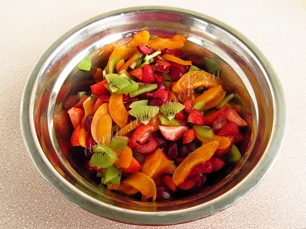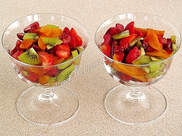 Разложить фруктово-ягодную смесь в креманки или вазочки.