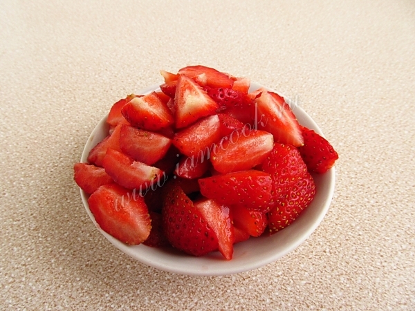 Ягоды клубники вымыть в проточной воде, обсушить бумажным полотенцем, удалить чашелистики и разрезать каждую ягодку на 4 части.