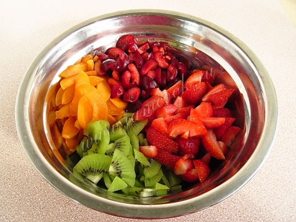 Для приготовления десерта нужно взять спелые клубнику, киви, черешню и абрикосы. Для соуса – мороженое пломбир и клубничный йогурт.