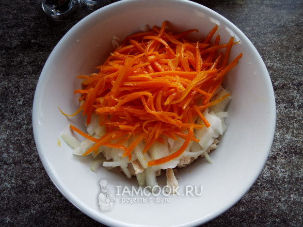 Добавить в миску к курице отжатый лук и остывшую морковь.