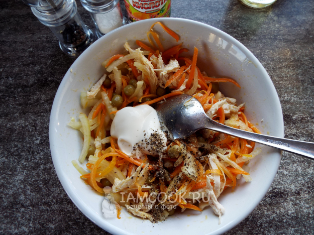 Подсолить, добавить майонез и чёрный перец.