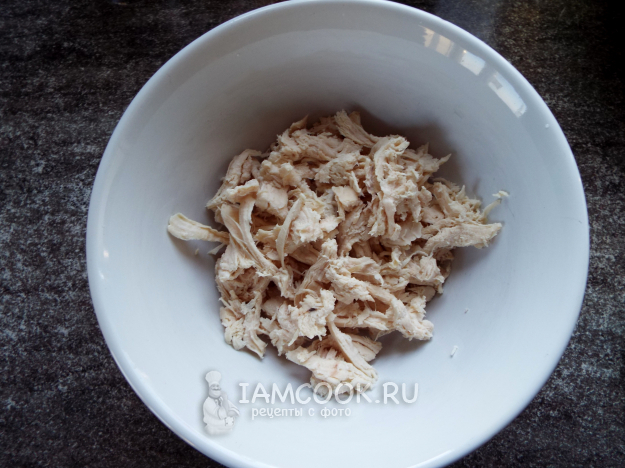Курицу надо заранее отварить до готовности в подсоленной воде и дать остыть.