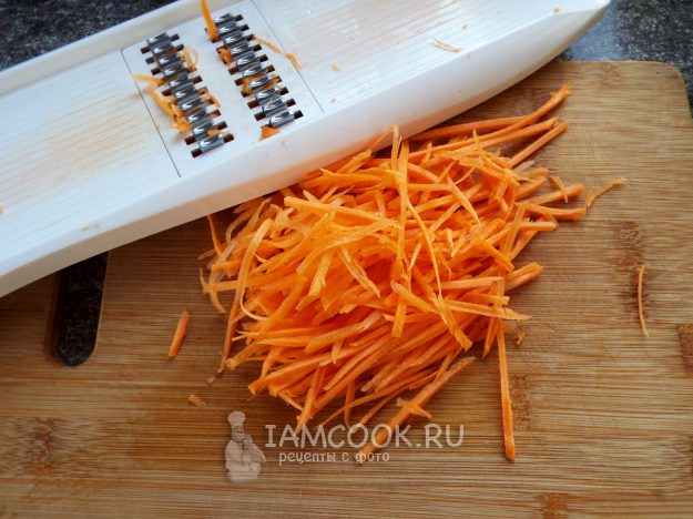 Морковь натереть на тёрке (хорошо подойдет тёрка для моркови по-корейски).