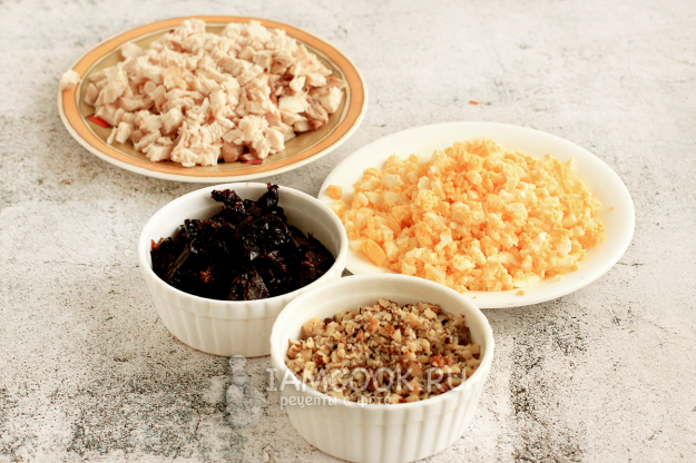 Чернослив залейте кипятком, промойте несколько раз и порежьте, а орехи измельчите.