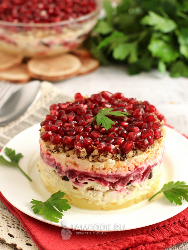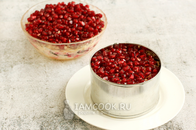 Собирать салат можно в формовочном кольце или в обычном салатнике. Что у меня получилось из данного количества продуктов, вы видите на фото. Салат "Графский" с гранатом готов!