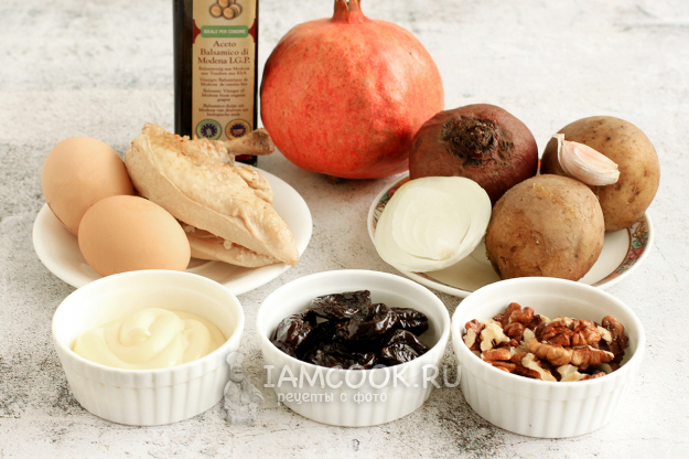 Для салата "Графский" с гранатом возьмите все необходимые по списку продукты.