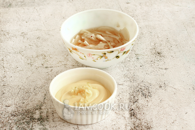 Майонез смешайте с раздавленным зубчиком чеснока.