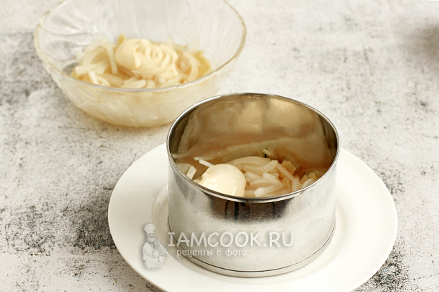 Отварной картофель и свеклу натрите на крупной терке. Далее осталось собрать салат.