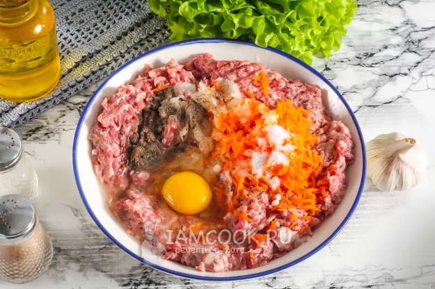 Всыпьте соль и молотый черный перец. Также отлично сочетаются по вкусу с мясом орегано, тимьян, розмарин, сладкая паприка и т.д. Тщательно вымешайте фарш.
