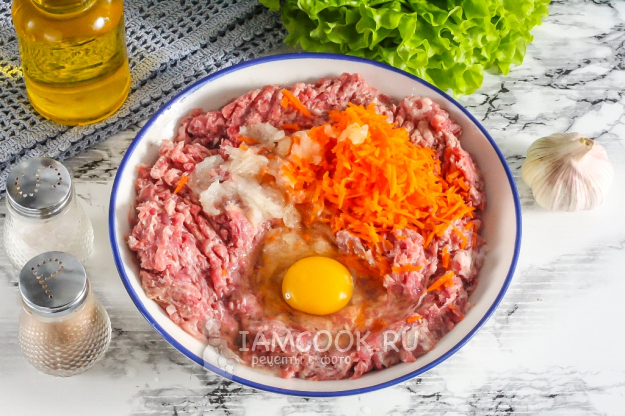Очистите лук, морковь и чесночный зубчик от кожуры, промойте в воде. Натрите морковь, чеснок и половину лука на терке с мелкими ячейками прямо в емкость с фаршем. Фарш я использую свиной, вы же можете использовать любой по вашему вкусу, и даже рыбный. Вбейте куриное яйцо небольшого размера, чтобы фарш не стал жидковатым.