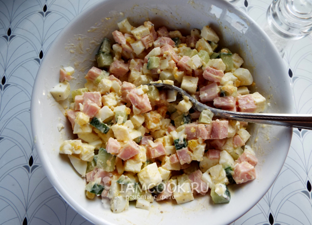 Можно готовить такой салат слоями или же подавать в перемешанном виде.