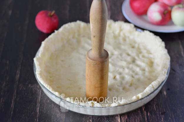 Тесто распределите руками по форме, сформировав бортики. А затем при помощи деревянной толкушки выровняйте толщину теста.