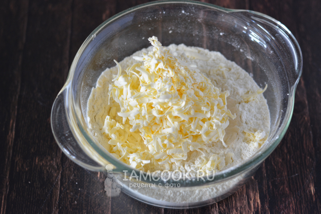 В рабочей миске смешайте муку с сухими ингредиентами (солью, сахаром, разрыхлителем и ванилином). Натрите на тёрке сюда же сливочное масло, перетрите масло с мукой в крошку.