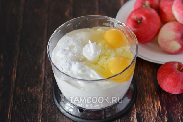 В чашу блендера поместите творог, сметану, яйца, сахар и ванилин.