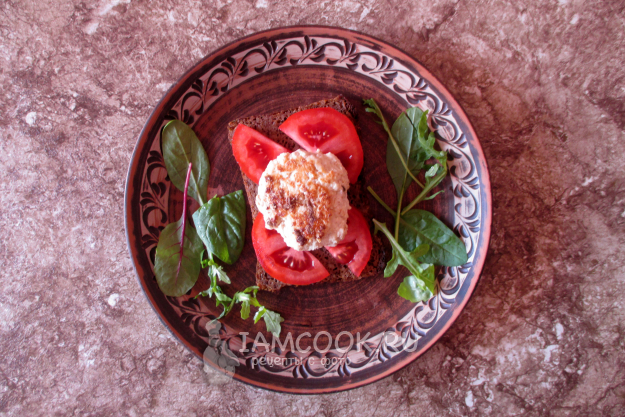 Подготовьте блюдо с ингредиентами, на которые будет уложен кручёный омлет. У меня это большой ломоть ржаного хлеба с семками, ломтики помидора, горячая или тёплая куриная рубленая котлета и салатные травки: рукола, шпинат и мангольд.