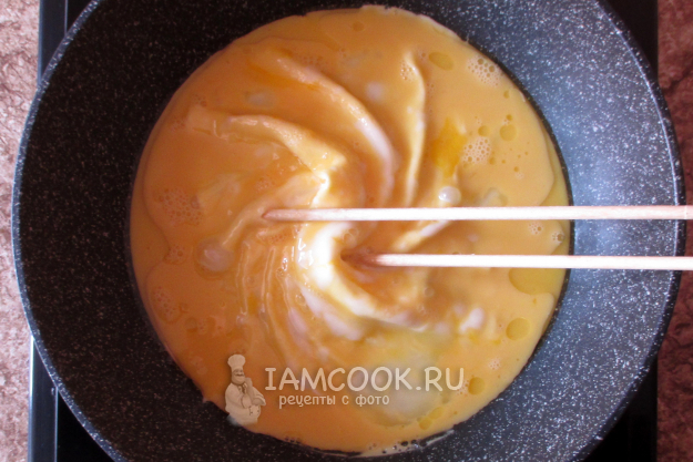 Вылейте яичную массу на сковороду. Примерно через минуту, как только чуток схватятся края, подтяните их друг к другу палочками для роллов. Расстояние между палочками оставьте около 3 см.
