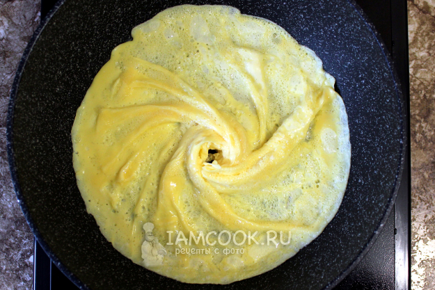 Потом разогрейте сковороду со сливочным топленым или с растительным маслом. Масла для «Торнадо» потребуется побольше, чем для обычного омлета.