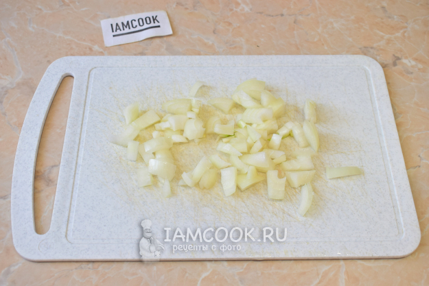 В это время мелко нарежьте очищенный лук. Выложите его в сковороду к мясу.