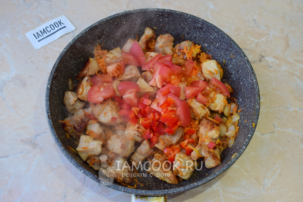 Следом добавьте нарезанные помидоры и болгарский перец. Прогрейте еще 3-4 минуты. Помидоры станут мягкими и пустят сок.