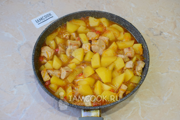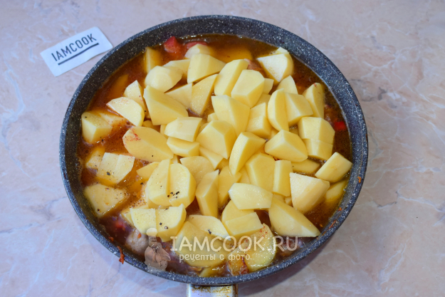 Картофель нарежьте крупными кусочками и залейте горячей водой. Воды можно добавить больше - тогда и подливы в блюде будет больше. По вкусу добавьте соль и специи. Тушите все под крышкой минут 20-30 на небольшом огне.