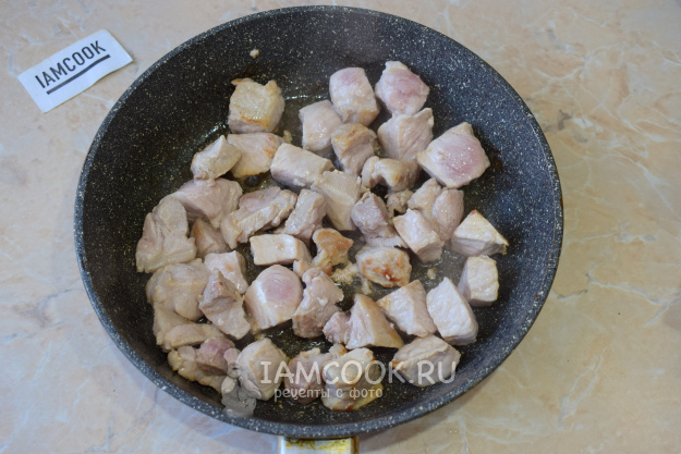 Мясо нарежьте на кусочки среднего размера и обжаривайте 5-7 минут с добавлением растительного масла. Мясо должно начать немного поджариваться.