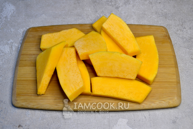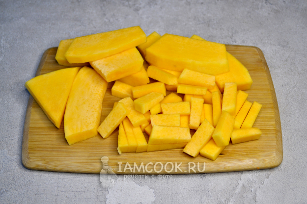 Затем каждый кусок тыквы нарежьте брусочками.