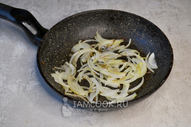 Лук очистите, нарежьте перьями и обжарьте на растительном масле 4-5 минут.