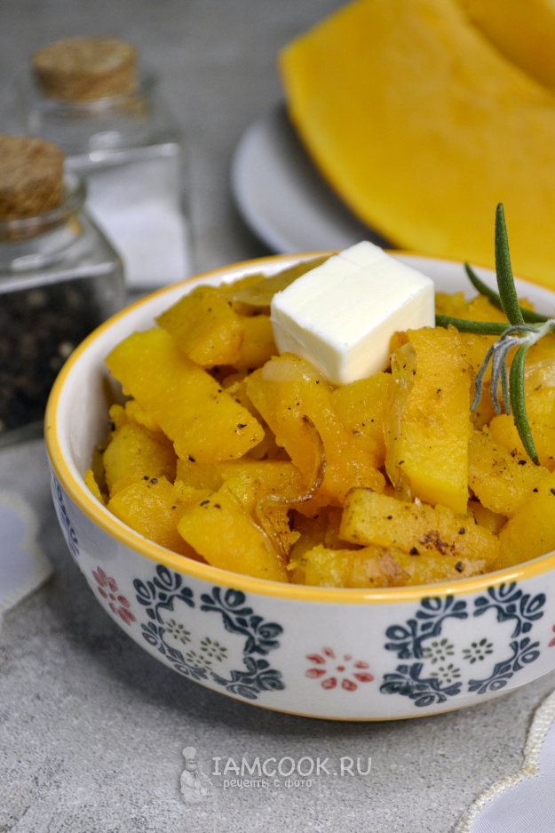 Подавайте жареную тыкву с луком сразу, горячей, с кусочком сливочного масла. Ароматно и вкусно. Приятного аппетита!