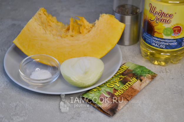 Продукты для приготовления жареной тыквы с луком на сковороде - перед вами.