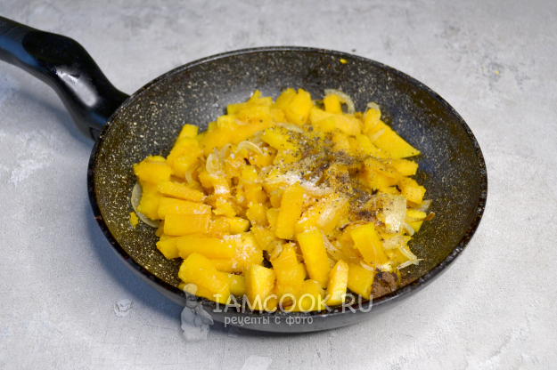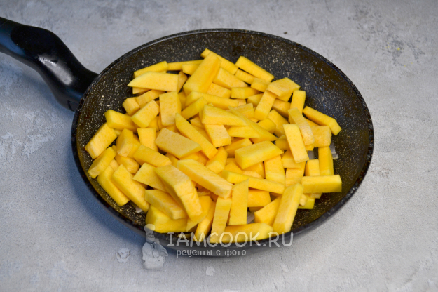 К луку положите тыкву. Помешивая, на среднем огне обжаривайте овощи 7-10 минут. Тыква должна стать мягкой и при этом не потерять форму, не развалиться. Время обжаривания будет зависеть от сорта тыквы и размера брусочков.