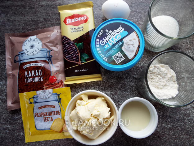 А чтобы приготовить брауни с творожным сыром, надо взять такие ингредиенты.