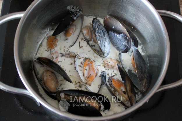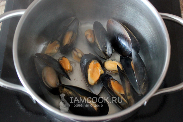 Поместите всё ещё замороженных мидий (в створках или без) в сотейник или кастрюльку с кипящим белым вином.