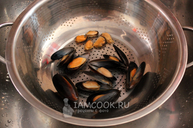 Удалите с замороженных мидий лёд, просто облив их горячей водой.