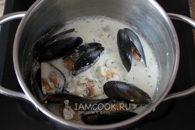 Переложите мидий в соусе «Блю чиз» в посуду для подачи. Сопроводите тостами из пористого белого хлеба.