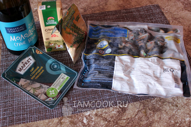 Для приготовления закуски из мидий в соусе «Блю чиз» подготовьте ингредиенты по списку к рецепту.