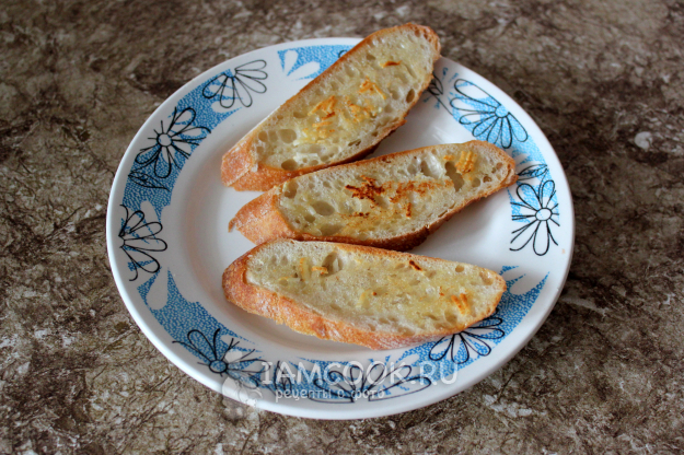 Подсушите ломти какого-либо белого хлеба на сковороде. По желанию перед жаркой можете смазать хлеб сливочным маслом и измельченным чесноком.