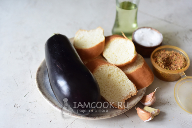 Подготовим необходимые ингредиенты для брускетты с запеченным баклажаном. Баклажан ополоснем, чеснок почистим.