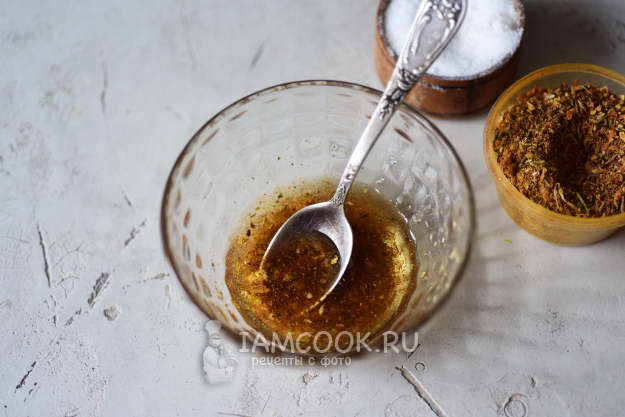 В мисочку зальем оливковое масло, выдавим через пресс 2 зубчика чеснока, добавим специи и все перемешаем.