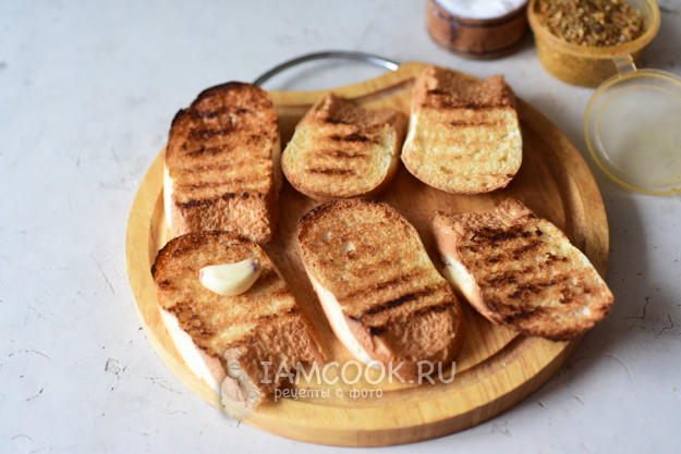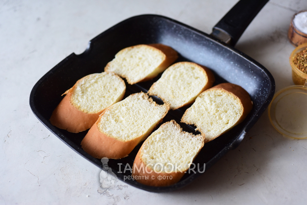 На сухой сковороде с одной стороны обжарим кусочки багета до аппетитной золотистой корочки.